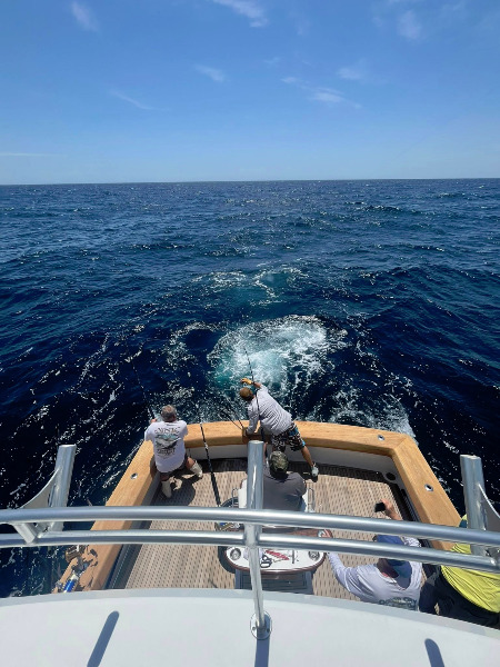 The FLY’N FISH is a 54 foot Custom Jim Smith equipped with twin 715hp Caterpillar Marine engines. She cruises at 26 knots and will get you to and from the fishing grounds both quickly and safely. She also boasts a large cockpit with mezzanine seating for fishing and a comfortable air conditioned salon to relax in during transit down time. If you find yourself hooked to a bruiser the cockpit also features a top of the line Release Marine fighting chair to aid in the battle.